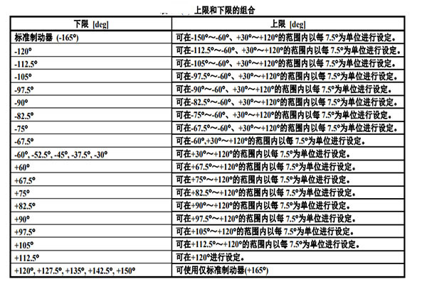 上限:設(shè)置可能范圍:可在-150°~-60°、+30°~+120°的范圍內(nèi)以每7.5°為單位進(jìn)行設(shè)定。
